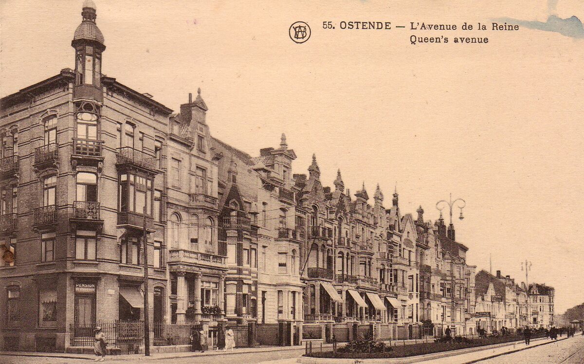 Walschaerts, N° 55. - Ostende - L'Avenuede la Reine. Queen's avenue. - De Koninginnelaan, met op de hoek met de Wellingtonstraat zien we een torenlogia van een herenhuis uit de Belle Epoque. Let op de sierlijke straatlantaarns en de altijd verzorgde bloemenperken door de groendienst van de stad