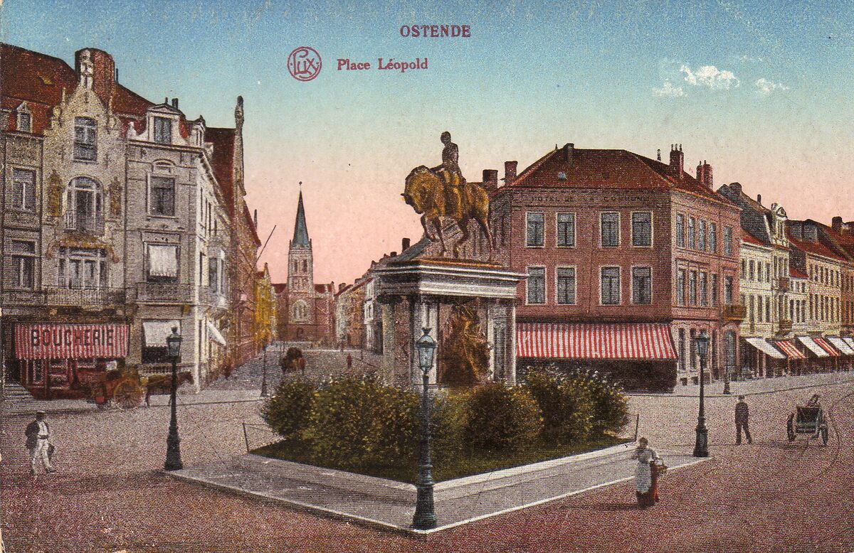 Lux. - Ostende - Place Léopold. - Gekleurde kaart. - Rechtdoor, de Rogierlaan met op het einde de Sint-Jozefskerk. Rechts, de Torhoutsesteenweg.