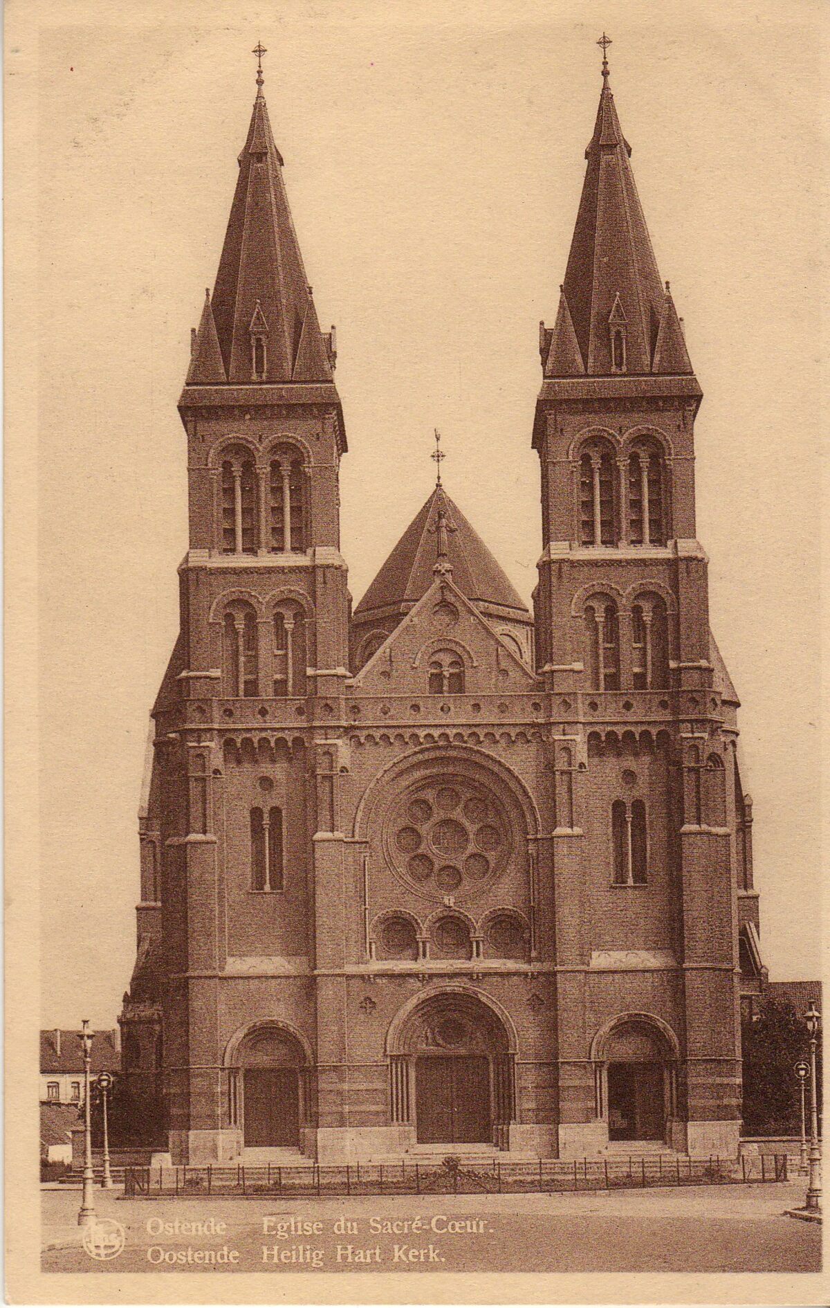 Nels. - Oostende - Heilig Hart Kerk. Ostende - Eglise du Sacré-Coeur. De Heilig Hartkerk (1912-1928) is een ontwerp van de architecten Auguste Verraert en Gustaaf Vandamme. Parochiekerk gebouwd in neoromaanse stijl.
