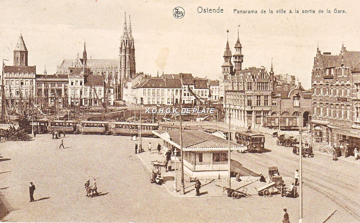Nels. Ern. Thill, Bruxelles, série 13, N° 10. - Ostende - Panorama de la ville à la sortie de la Gare. - De wijk Hazegras. Het tramwachthuisje voor de stads- en kusttram op het Vandersweepplaats. Links, een ijscokar. Het gebouw met torentje is het politiebureau en rechts aansluitend de stedelijke opslagplaats. Schepen gemeerd in het eerste handelsdok. Op de achtergrond, de Keizerskaai en de Sint Petrus en Pauluskerk. Links, de toren van de door brand vernielde Sint-Pieterskerk, genaamd "De Peperbusse"