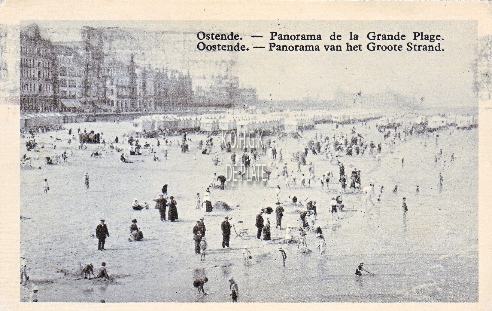 U.P.B. - Strandrecreatie op het Groot Strand, met achteraan, de traditionele badkarren. Links, de grote hotels langs de Zeedijk