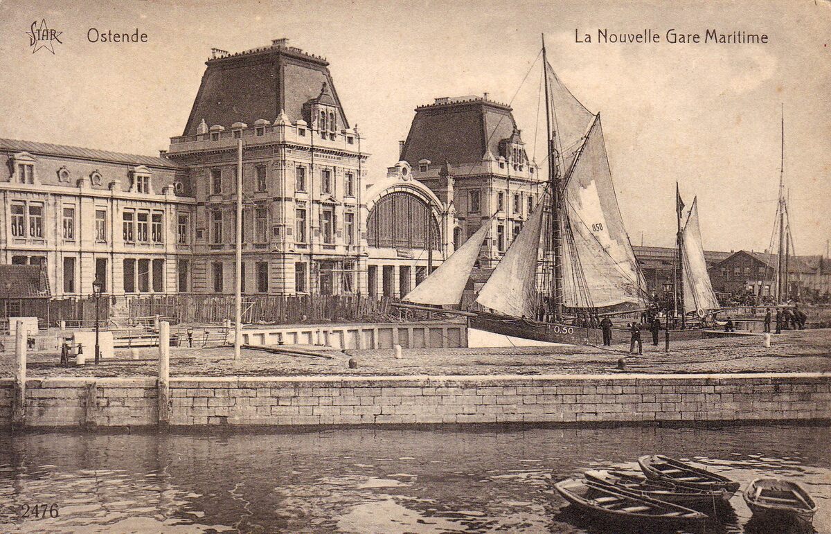 Star, N° 2476. - Ostende - La Nouvelle Gare Maritime. - Het Zeestation nadert zijn voltooing. Vooraan, enkele jollen in de Visserskreek. De Oostendse tweemastsloep O.50 ligt in de sluis van het handelsdok die toegang gaf tot de havengeul