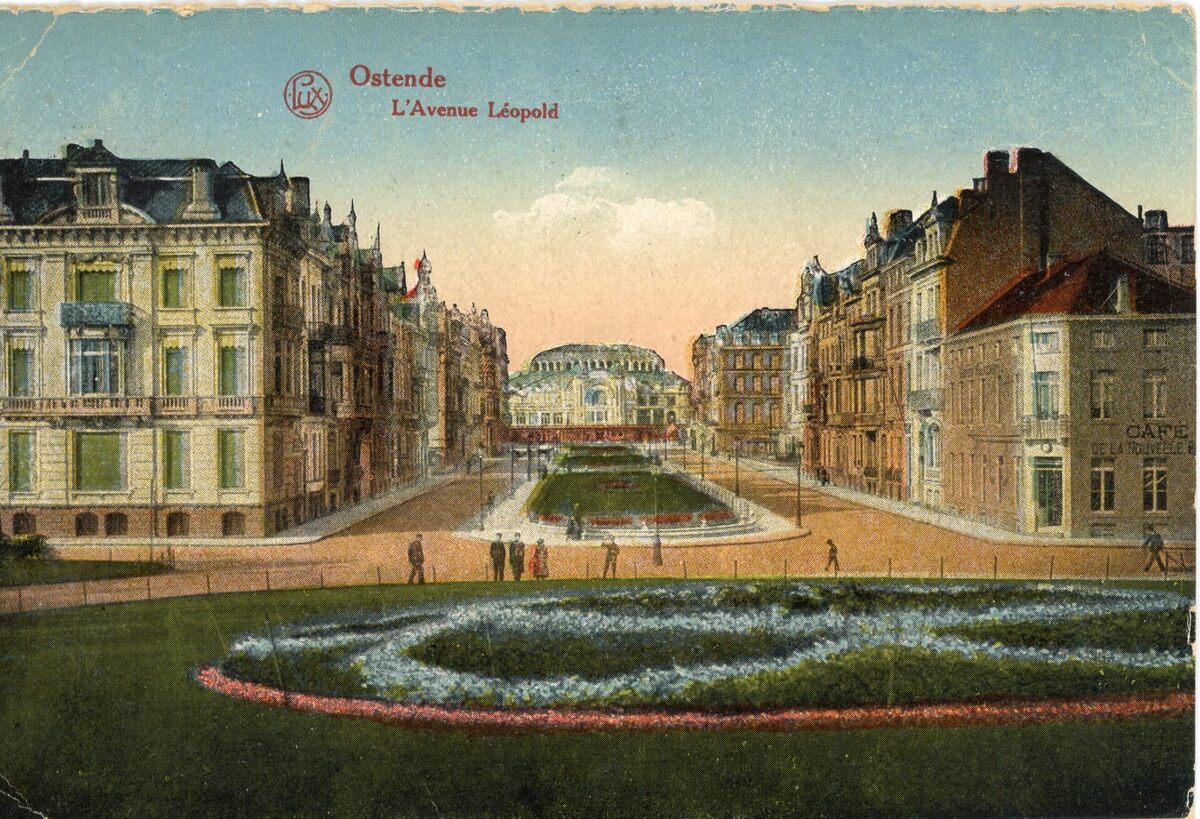 Lux/MBCP, série 116, 7. - L'Avenue Léopold. - Bijgekleurde kaart. - Op het einde van de Leopoldlaan, de zuidgevel van het tweede Kursaal, gezien vanaf het Leopoldpark. Rechts en links, de Karel Janssenslaan. Let op de mooie bloemenperken