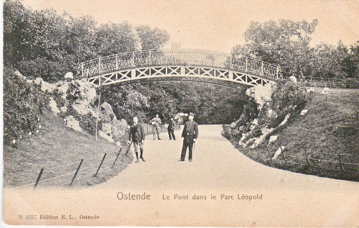 Postkaart E.L.. - La pont dans le parc Léopold. - De ijzeren brug die voor de verbinding zorgde tussen de Trinkhall en de fontein