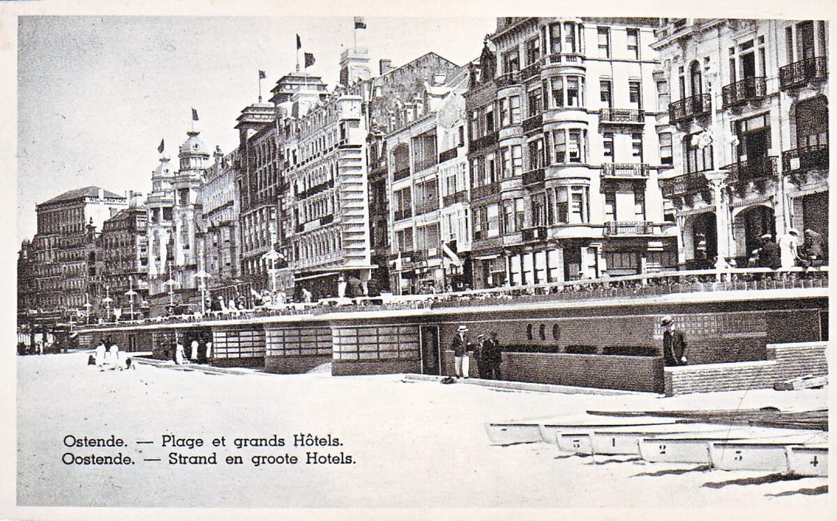 Postkaart U.P.B. - Het Groot Strand. De badinstallaties onder de Albert I-promenade. Rechts, de grote hotels. Oostende in het interbellum.