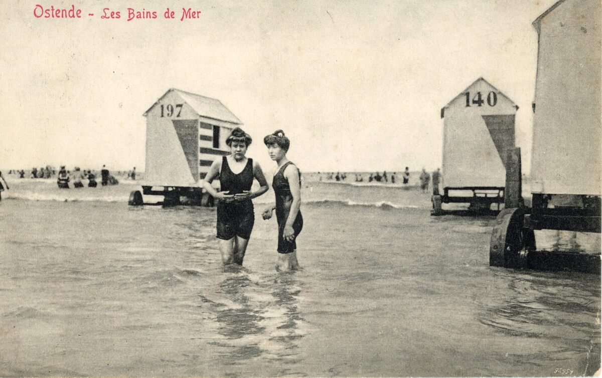 Victor Grégoire/V.G. - Ostende - Les bains de mer. - Twee vrouwen doen aan pootjebaden. We zien de traditionele badkarren.