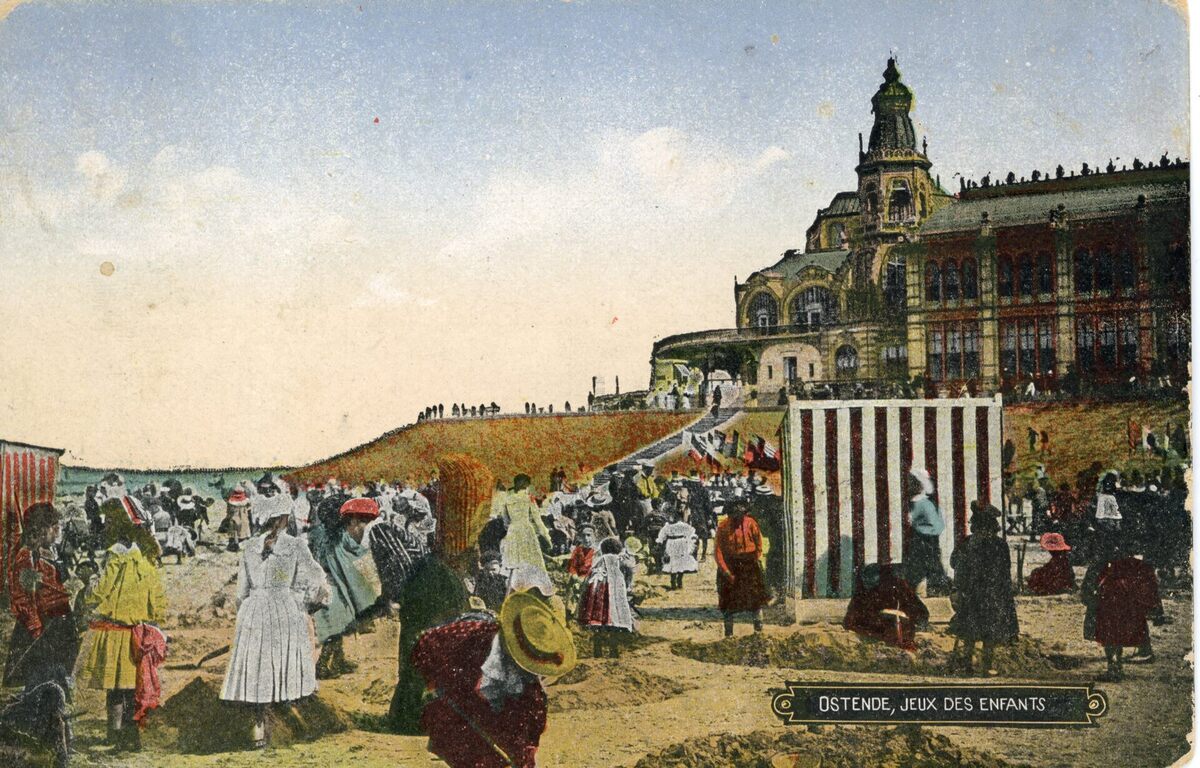 Ostende - Jeux des enfants. - Bijgekleurde kaart. - Strandrecreatie op het Groot Strand, met op de achtergrond, een gedeelte van de westgevel van het derde Kursaal langs de Zeedijk