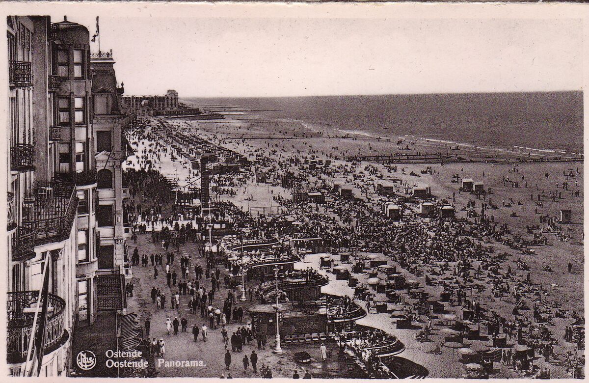 Nels. - De Zeedijk ten westen van het Kursaal. De badinstallaties onder de zeedijk en strandrecreatie op het Groot Strand.