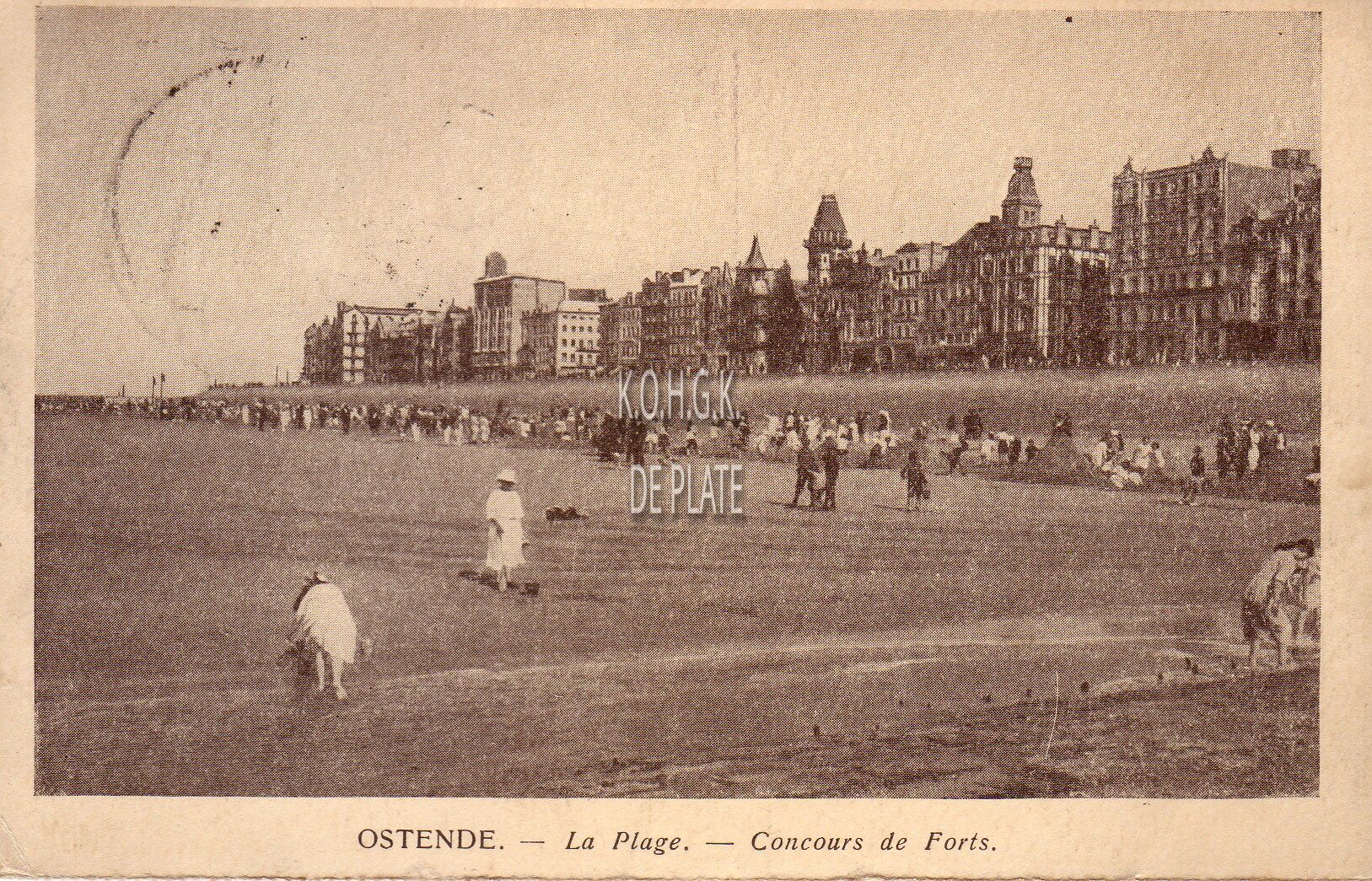 Postkaart.Ostend - La Plage. Concours de forts. - Wedstrijd zandkastelen bouwen op het Groot Strand, Wie zijn "fort" of zandkasteel de opkomende zee het langst weerstond, die had gewonnen. - Voor de jeugd in het interbellum, maar ook na de Tweede Wereldoorlog werden die wedstrijden dikwijls gehouden, o.a. door de krant Le Soir.