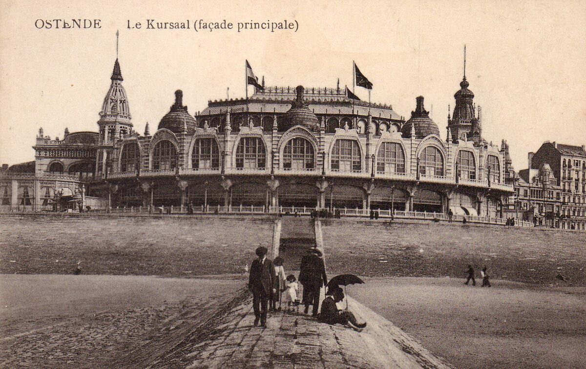 Ostende - Le Kursaal (façade principale). - De noordgevel van het derde Kursaal gelegen langs de Zeedijk. Vooraan, het Groot Strand en golfbreker.