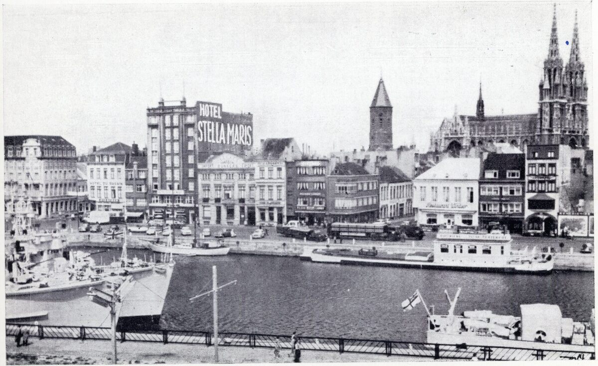 Leys. - Gedeelte van de Vindictivelaan tussen de Kapellestraat (links), de huidige Dekenijstraat (midden) en de Zuidstraat (rechts). Het grote gebouw is Hotel Stella Maris. Vooraan, het eerste handelsdok met enkele oorlogsschepen en centraal het oesterschip van Zoete. Op de achtergrond, de Peperbusse (toren Sint Pieterskerk) en de Sint -Petrus- en -Pauluskerk