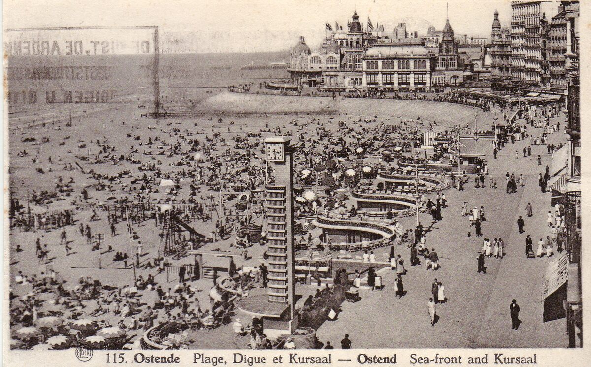 Strandrecreatie op het groot strand nabij de badinstallaties onder de Albert I-Promenade. De lichtkolom met uurwerk en op de achtergrond de westelijke gevel van het derde Kursaal