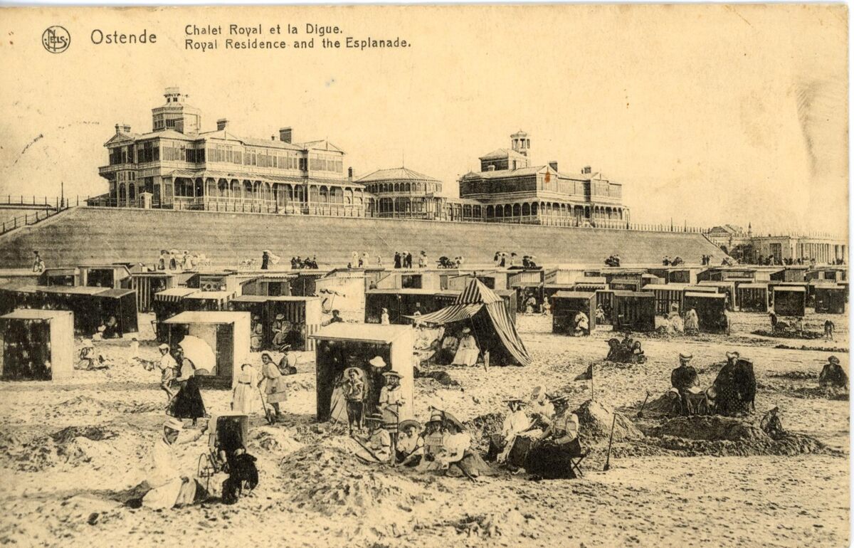 Nels. - Het Koninklijk Chalet langs de Zeedijk, gezien vanaf het Groot Strand. Strandrecreatie in de Belle Epoque