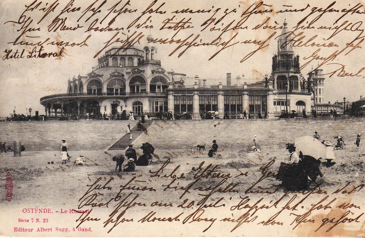 Excelsior. Editeur Albert Sugg, à Gand. Dérie 7, N.23. - Ostende - Le Kursaal. - De westgevel van het tweede kursaal, gelegen langs de Zeedijk. Vooraan het Groot Strand