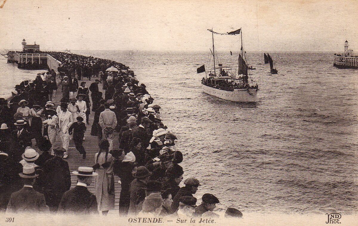 [Neurdein], ND Phot, N°301. - Ostende - Sur la jetée. Het excursieschip "La Marguerite" vaart de haven van Oostende binnen. Veel volk op het Weststaketsel.