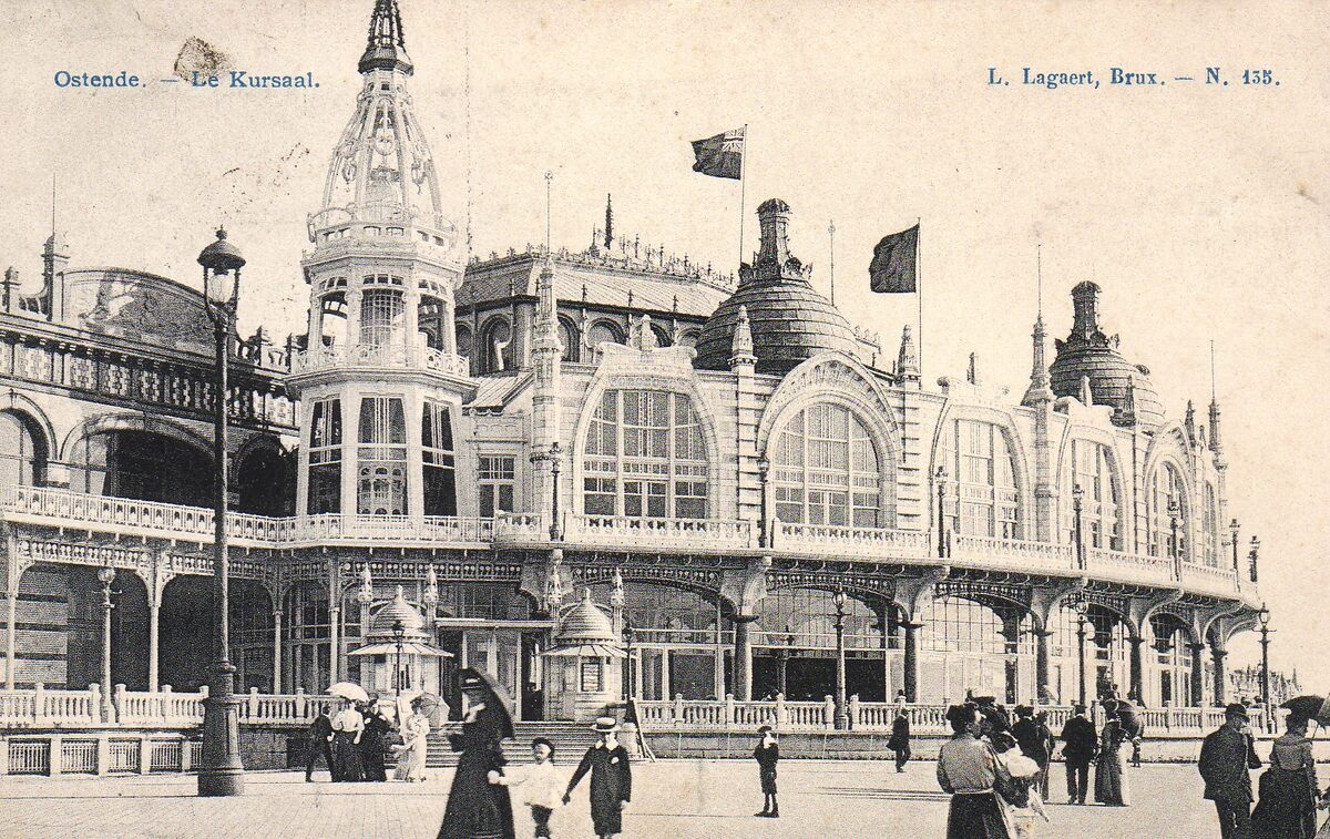 L. Lagaert, Brux., N° 135. - Ostende - Le Kursaal. - De noordgevel van het derde Kursaal, gelegen langs de Zeedijk. Links, één van de eerste lantaarns met elektrische verlichting.
