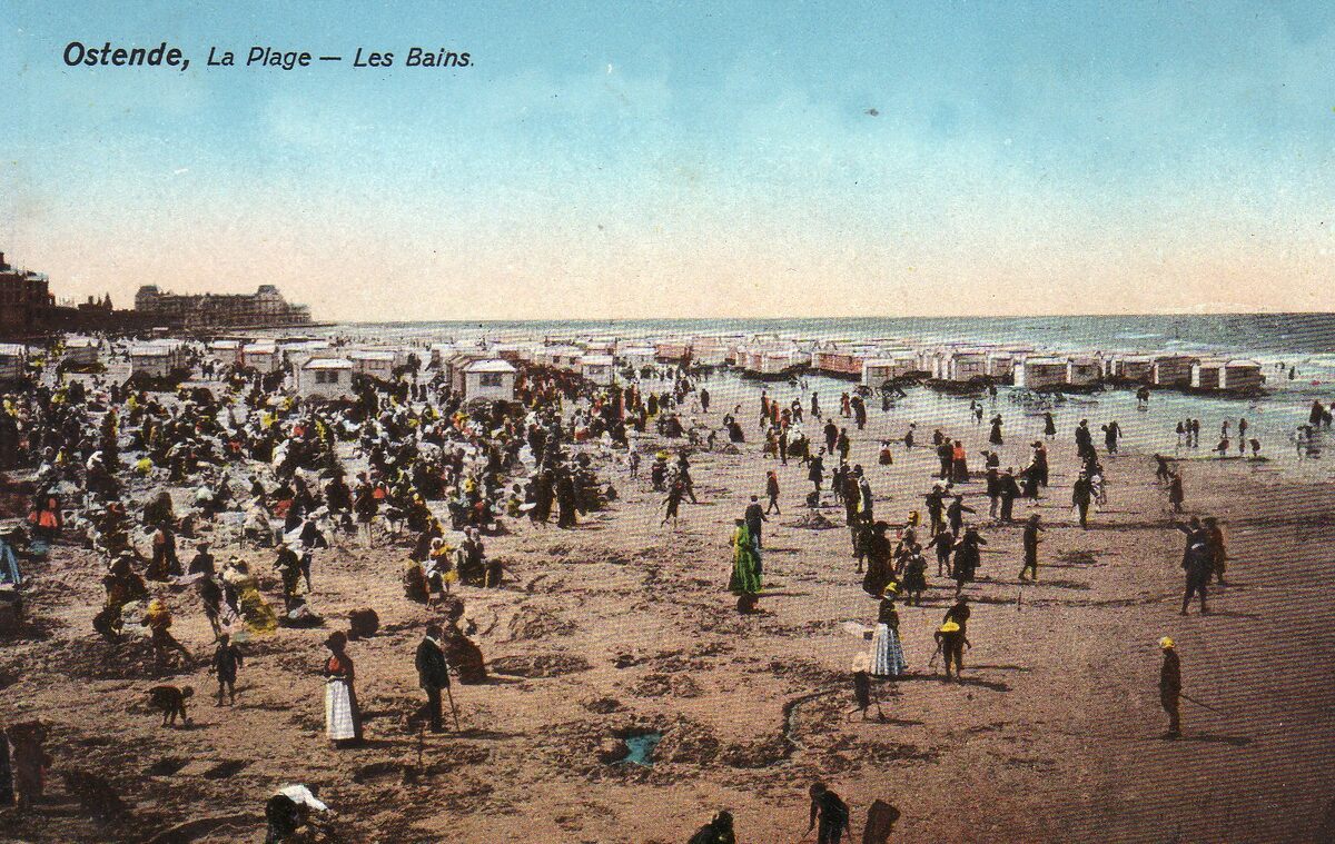 Le Bon, éditeur, Ostende. - Ostende - La Plage. Les Bains. - Gekleurde kaart. - Strandrecreatie op het Groot Strand. Op de achtergrond, de traditionele badkarren. Links, een glimp van het "Royal Palace Hotel"