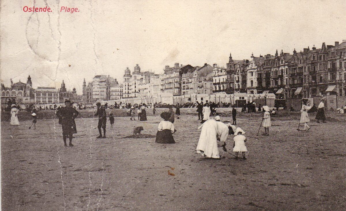 Carte Lux. - Ostende - Plage. - Strandrecreatie op het Groot Strand. Rechts, de grote hotels en op het einde, gedeelte van de westgevel van het derde Kursaal