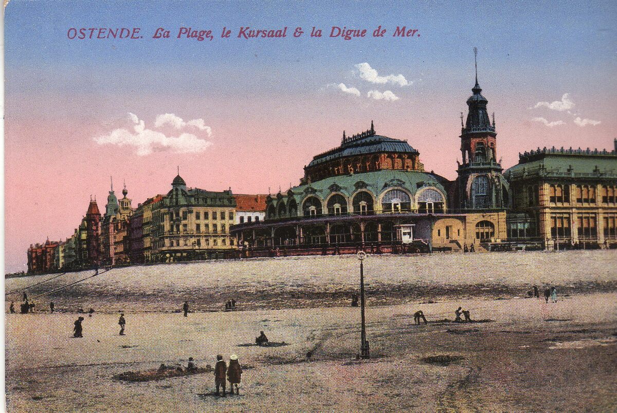 Scheers/Sch. Br. - Ostende - La Plage, le Kursaal et la Digue de Mer. - Gekleurde kaart. - Een gedeelte van de west- en noordgevel van het derde Kursaal, tijdens de verbouwing, langs de Zeedijk, met zicht op de hotels en villa's ten oosten van het Kursaal. Vooraan, het Groot Strand.