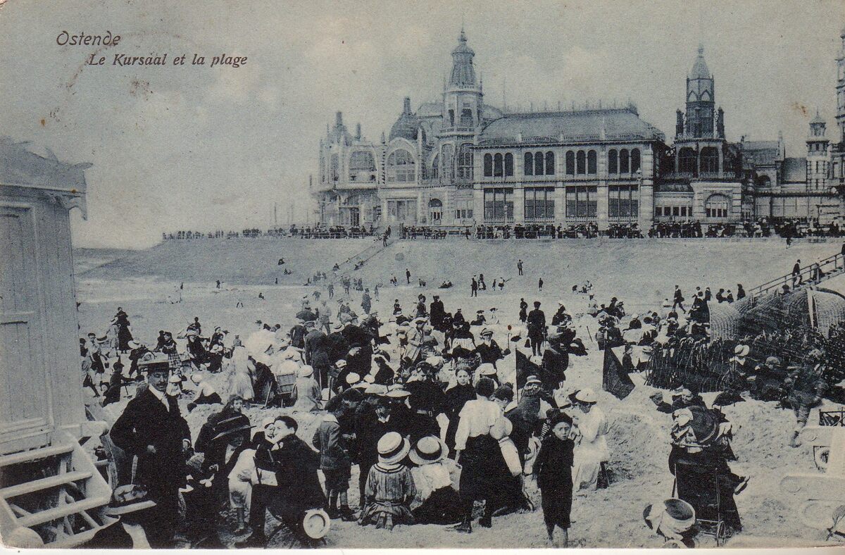 Edit. V.G.[= Victor Grégoire], 42, Avenue du Midi Bruxelles. - Ostende - Le Kursaal et la plage. - Strandrecreatie op het Groot Strand nabij de westelijke gevel van het derde Kursaal langs de Zeedijk