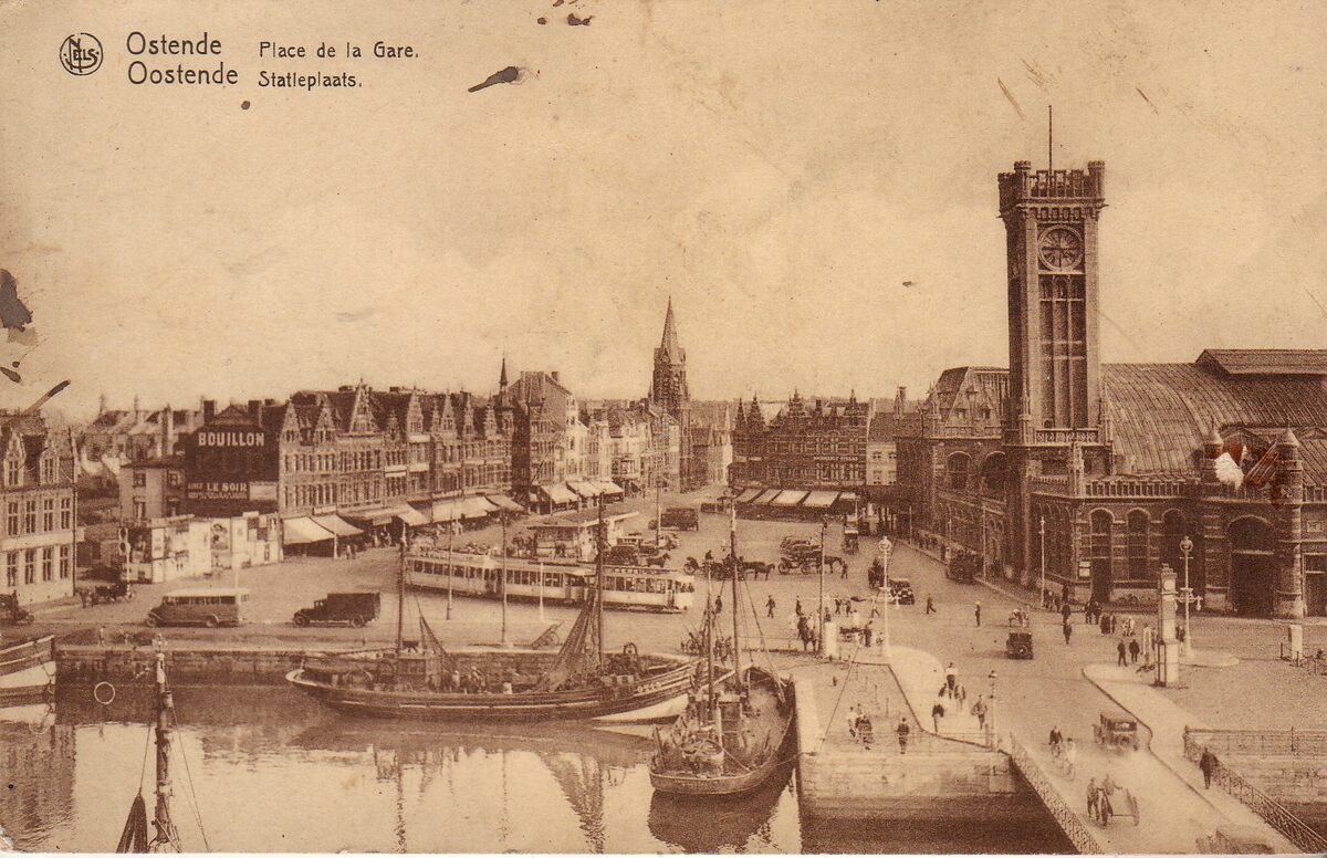 Nels. - Ostende - Place de la Gare. Oostende - Statieplaats. - De wijk Hazegras. Vooraan, twee vissersvaartuigen gemeerd in het eerste handelsdok. Rechts, de Kapellebrug naar de Vandersweepplaats, met rechts het tweede spoorwegstation van Oostende (Oostende-Stad). De kusttram met halte aan het tramwachthuisje