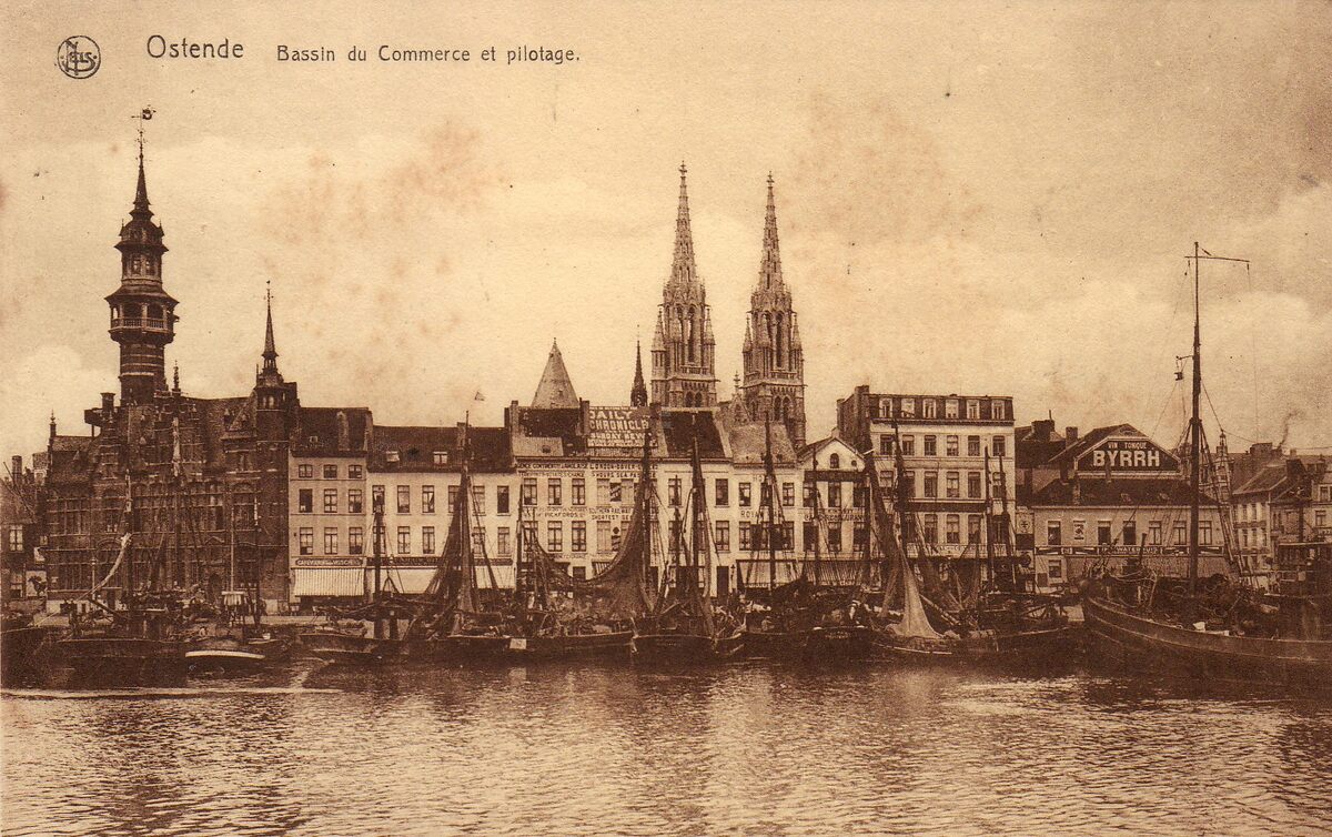 Nels. - Ostende - Bassin du Commerce et pilotage . - Vissersvaartuigen gemeerd in het eerste handelsdok langs de Vindictivelaan. Rechts, brasserie "Waterhuis". Links, het Zeevaartcommissariaat, ook "Pilotage" genaamd. Op de achtergrond, een gedeelte van de torens van de Sint Petrus en Pauluskerk en ernaast de torenspits, of "De Peperbusse" van de door brand vernielde Sint Pieterskerk