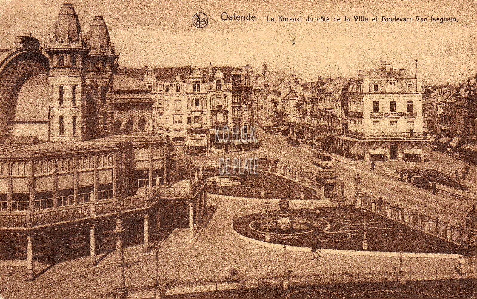 Nels. - Ostende - Le Kursaal du côté de la Ville et Boulevard Van Iseghem. - De hovingen, gelegen langs de zuidgevel van het derde Kursaal. Rechts, de Langestraat. Een stadstram rijdt in de Van Iseghemlaan.
