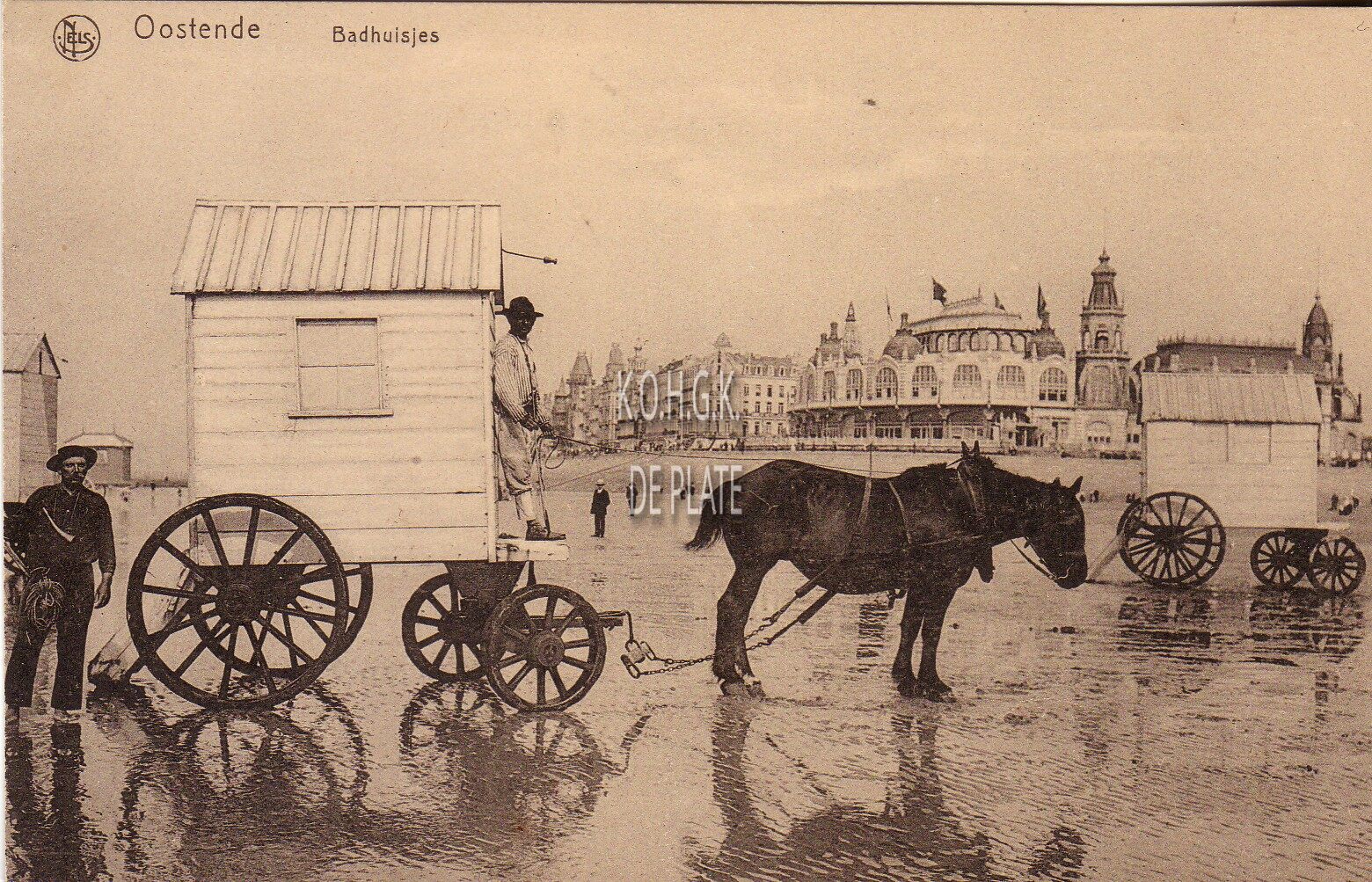Nels. - Oostende - Badhuisjes. - Het personeel van de badendienst aan het werk op het Groot Strand. Op de achtergrond, het derde Kursaal langs de Zeedijk