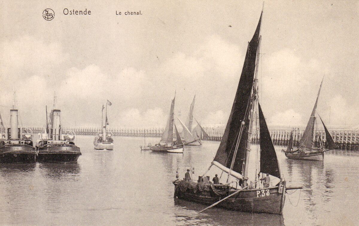 Nels. - Ostende - Le chenal. - Wat beweging in de havengeul. Een vissersvaartuig P.33 uit De Panne en een paar Oostendse zeilvisserssloepen. Twee sleepboten, gemeerd aan het Weststaketsel
