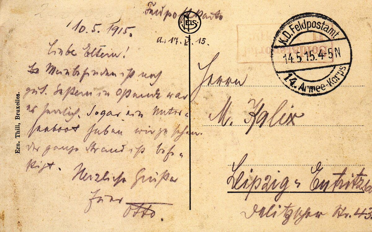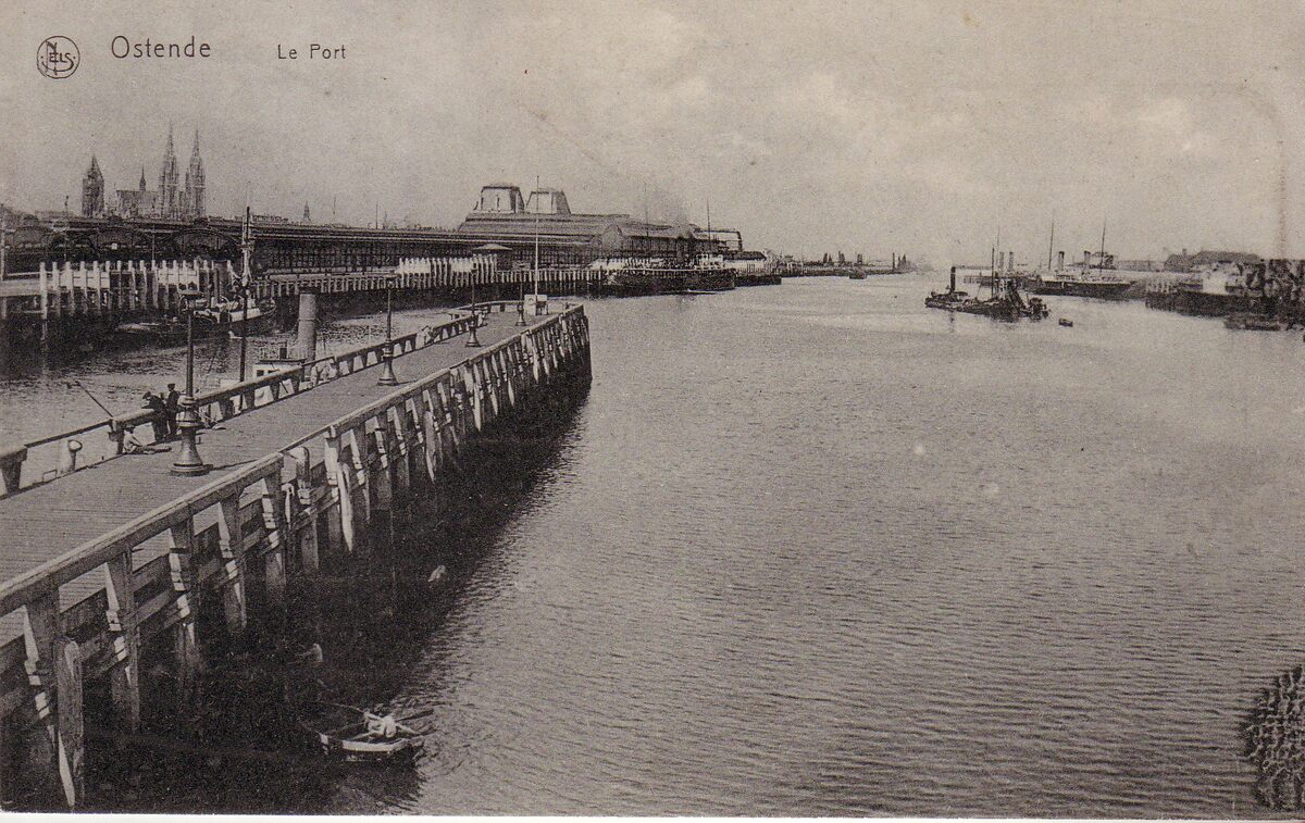 Nels. Ern. Thill, Bruxelles. - Ostende - Le Port. - Een pakketboot van de Oostende - Doverlijn aangemeerd nabij het Zeestation. Op de achtergrond, de torens van de Sint Petrus en Pauluskerk en links, de toren van de door brand vernielde Sint-Pieterskerk, genaamd "De Peperbusse". - Prentkaart van 10/05/1915 verzonden door een Duits militair en afgestempeld : K.D. Feldpostambt. 14 5 15.4-5 N van het 14.Armee-Korps