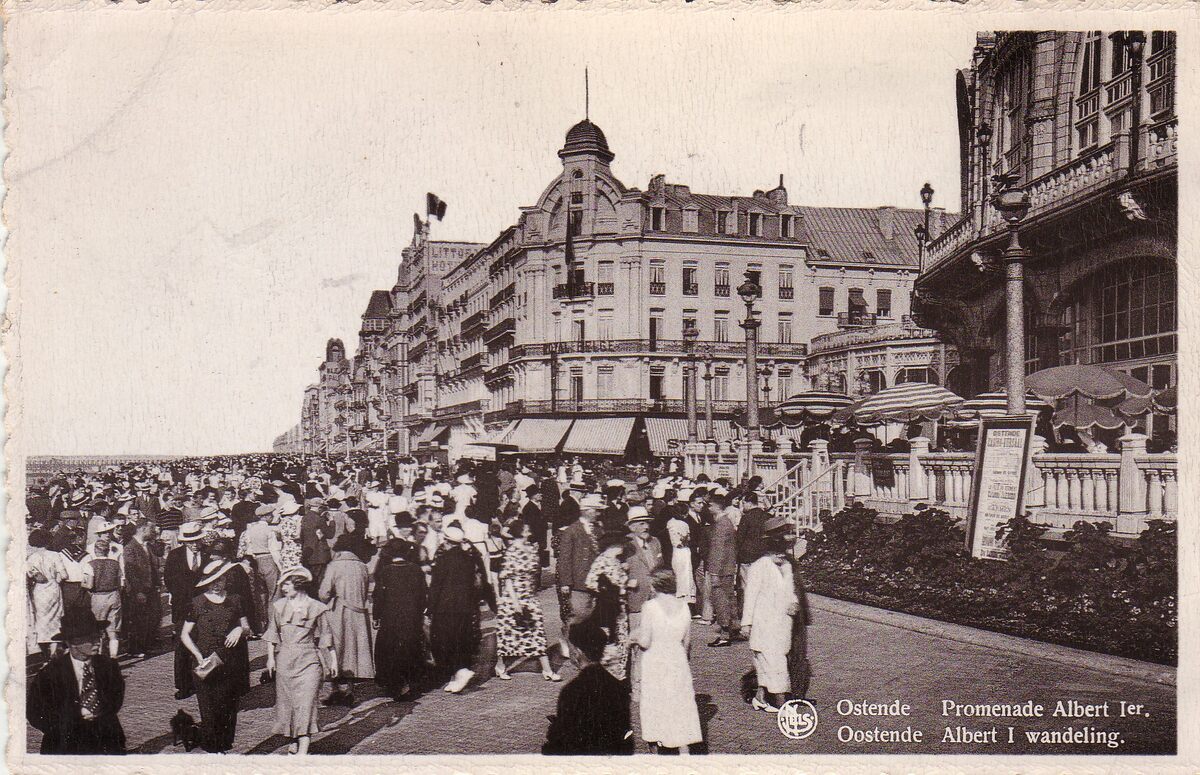 Nels - Ostende - Promenade Albert Ier. Oostende - Albert I wandeling. - De Albert I-promenade ten oosten van het derde Kursaal. Een mooie dag. Veel volk op de wandel en op het terras van het Kursaal. Op de hoek met Oosthelling-Kursaal, het "Hôtel Royal Belge". Oostende in het interbellum.