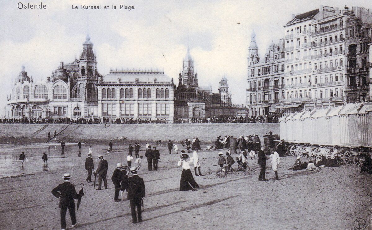 Nels. - Ostende - Le Kursaal et la plage. - We zien het Groot Strand en rechts, de traditionele badkarren. De Zeedijk met de grote hotels en de westgevel van het derde Kursaal