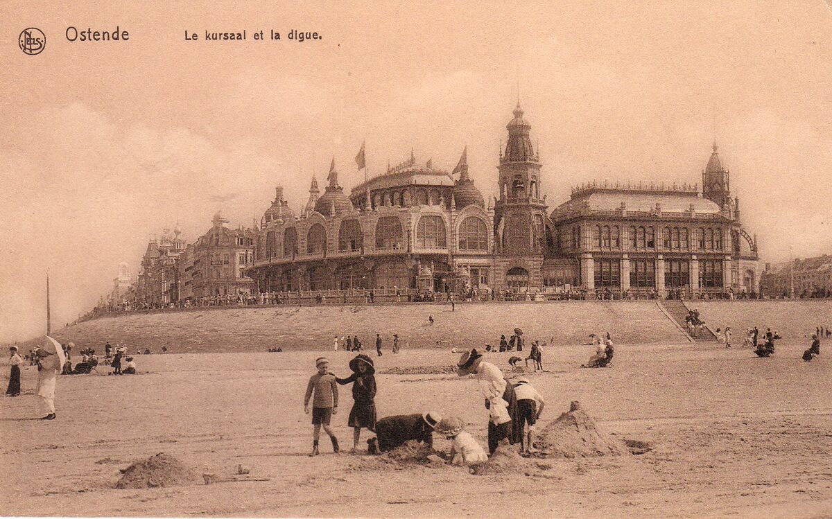 Nels. - Ostende - Le kursaal et la digue. - Kinderen spelen op het Groot Strand. - We zien de west- en noordgevel van het derde Kursaal langs de Zeedijk en ook de villa's en hotels ten oosten ervan