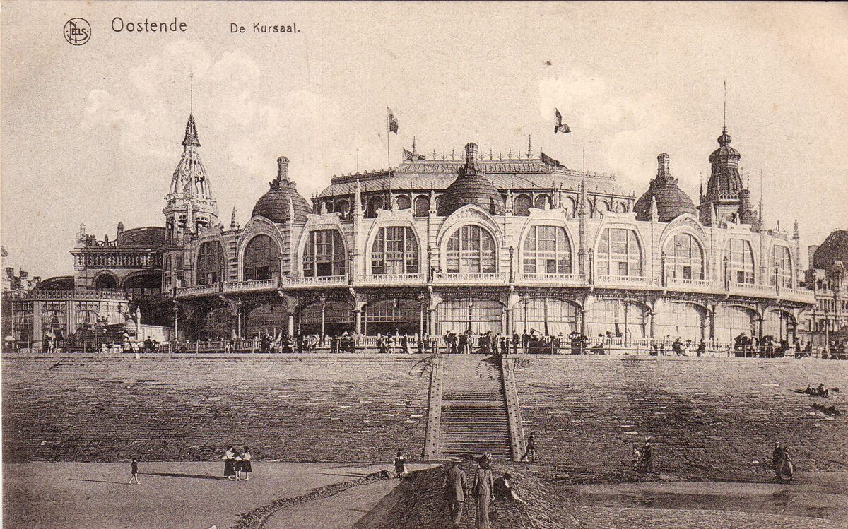 Nels. - Oostende - De Kursaal. - De noordgevel van de derde Kursaal langs de Zeedijk. Het Groot Strand met golfbreker