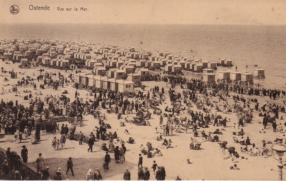 Nels. - Ostende - Vue sur la mer. - Een drukke zomerdag op het Groot Strand. De traditionele badkarren. Let op de belangstelling langs de vloedlijn voor de baders