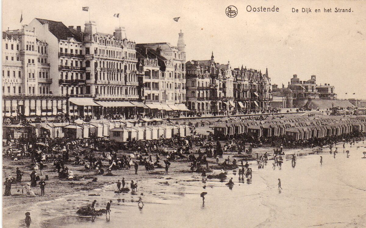 De Zeedijk ten westen van het Kursaal, gezien richting het Koninklijk Chalet. Strandrecreatie op het Groot Strand