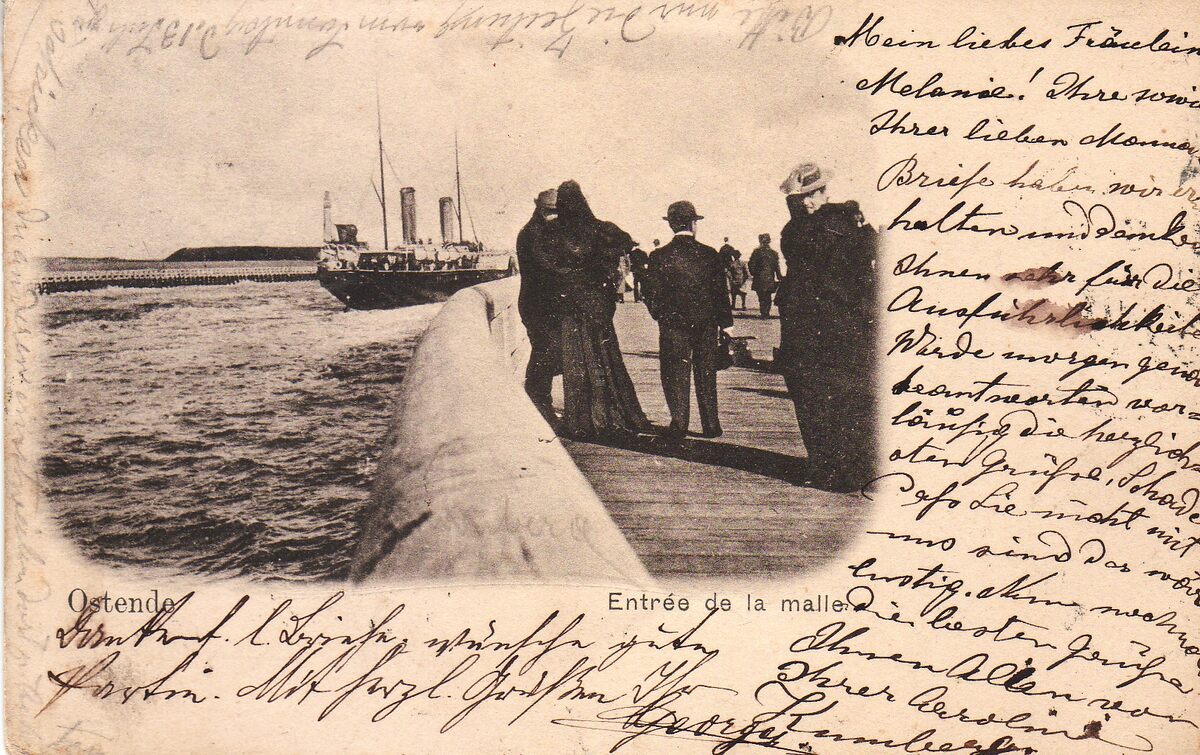Ostende - Entrée de la malle. - Oostende in de Belle Epoque. Een pakketboot van de Oostende Dover lijn vaart de haven van Oostende binnen. Vooraan, het Weststaketsel