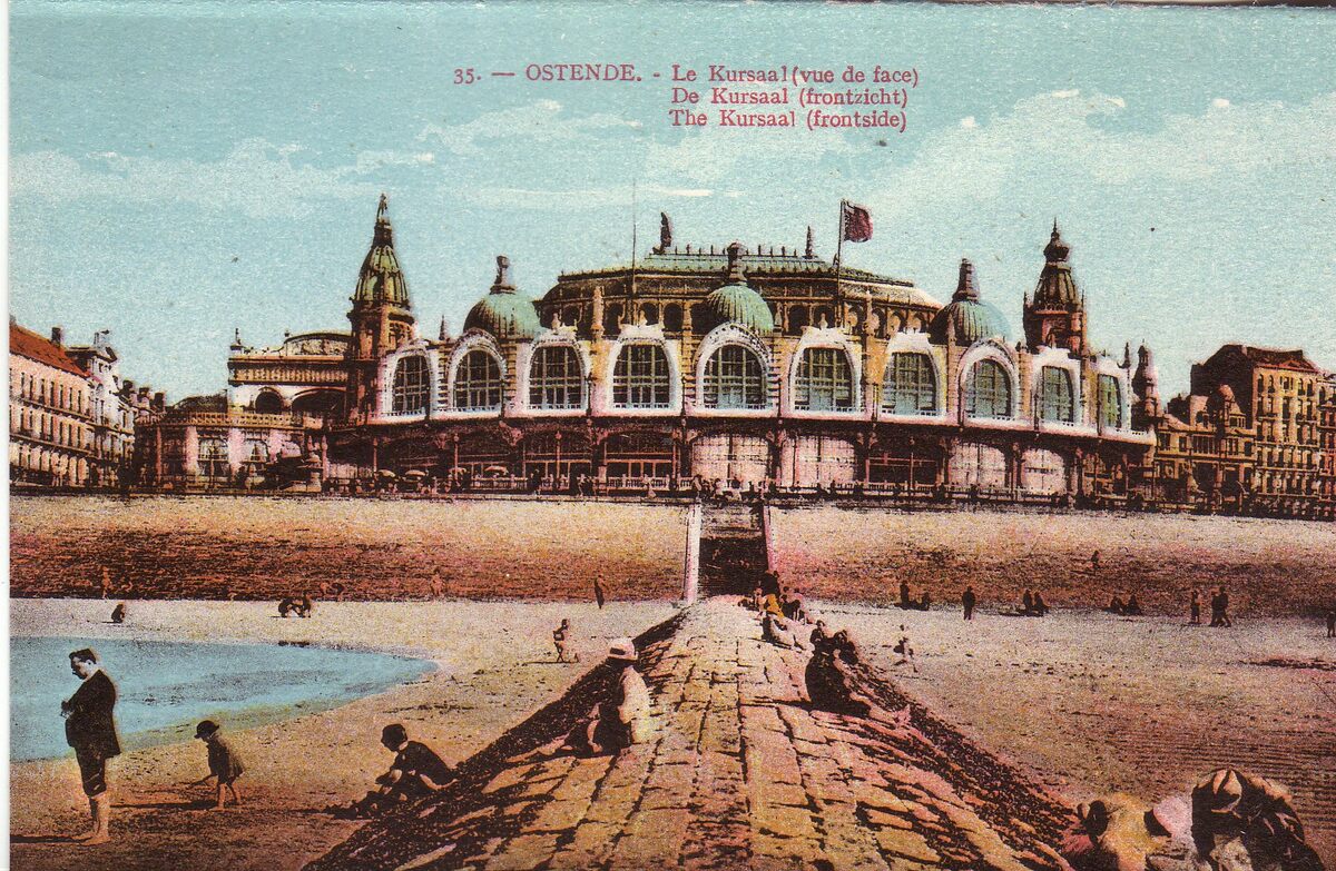 N° 35. - Ostende - Le Kursaal (vue de face). De Kursaal (frontzicht). The Kursaal (frontside). - Bijgekleurde kaart. - De noordgevel van het derde Kursaal langs de Zeedijk. Vooraan, het Groot Strand en golfbreker.