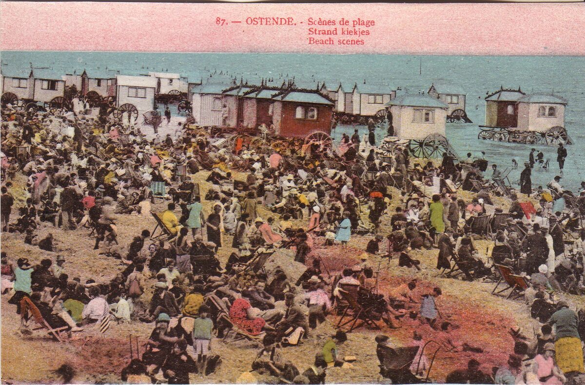 N° 87. - Ostende - Scènes de plage. Strand kiekjes. Beach scenes. - Bijgekleurde kaart. - Strandrecreatie, waarschijnlijk op het Groot Strand. Aan de vloedlijn, de tradtionele badkarren.