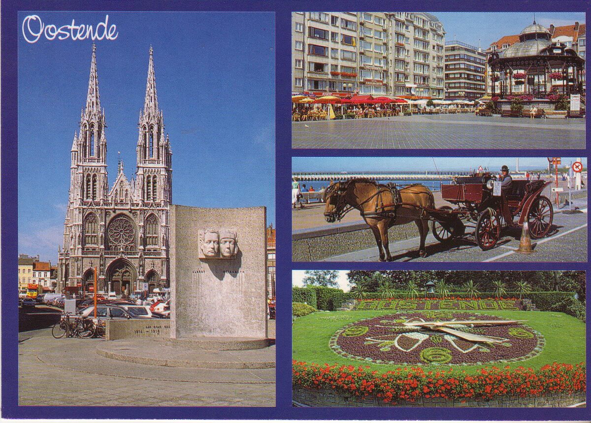 AVM. - Het Sint Petrus en Paulusplein met vooraan het oorlogsmonument voor alle Oostendenaars gesneuveld in beide wereldoorlogen. Staat nu nabij de Koninginnekapel in de Jozef II-straat. De Sint Petrus en Pauluskerk. Een koetsier met paard en koets, een vertrouwd beeld tijdens de vakantie, wacht op toeristen nabij het Zeeheldenplein. De kiosk op het Wapenplein. Het bloemenuurwerk in het Leopoldpark