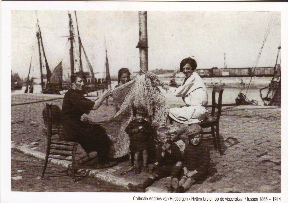 Postkaart herdruk. - Collectie Andries van Rijsbergen. - Netten breien op de Visserskaai