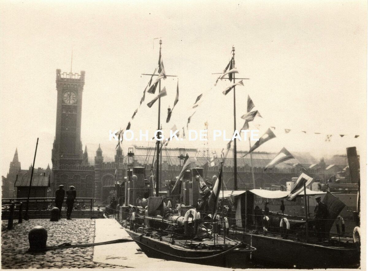 Formaat : 9 x 11,5 cm. - Op de voorgrond vaartuigen versiert met wimpels. Op de achtergrond het tweede spoorwegstation van Oostende (Oostende-Stad)