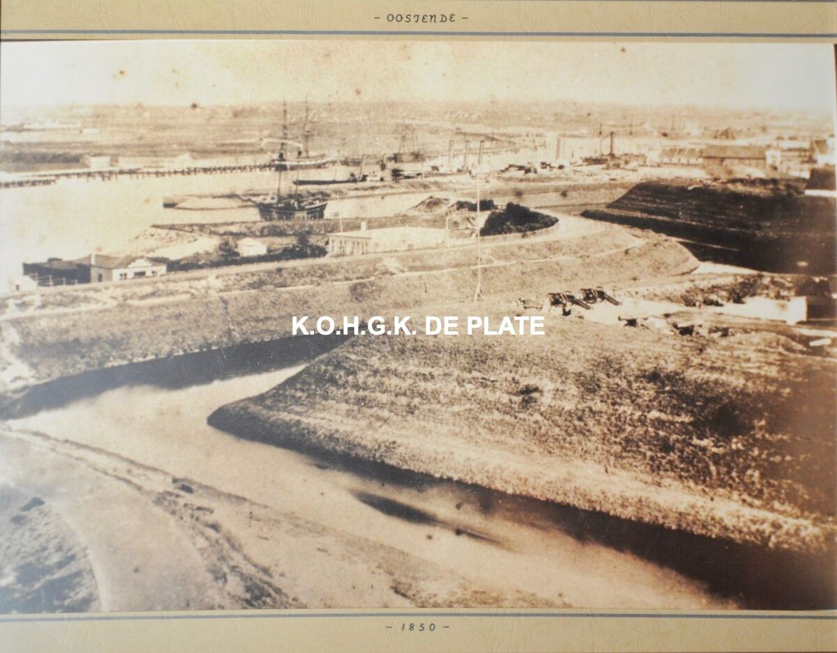 Zicht van de oostelijke vestingen, met rechts van de gracht het "Bastion" met kanonnen en links ervan de dijk. Achter de dijk ligt de oesterput van Musin. Het gebouw met plat dak, centraal. Een zeilschip ligt op de kuisbank. Langs de Quai aux Bateaux à Vapeur, de landtong naast de kuisbank, liggen enkele kleine pakketboten gemeerd