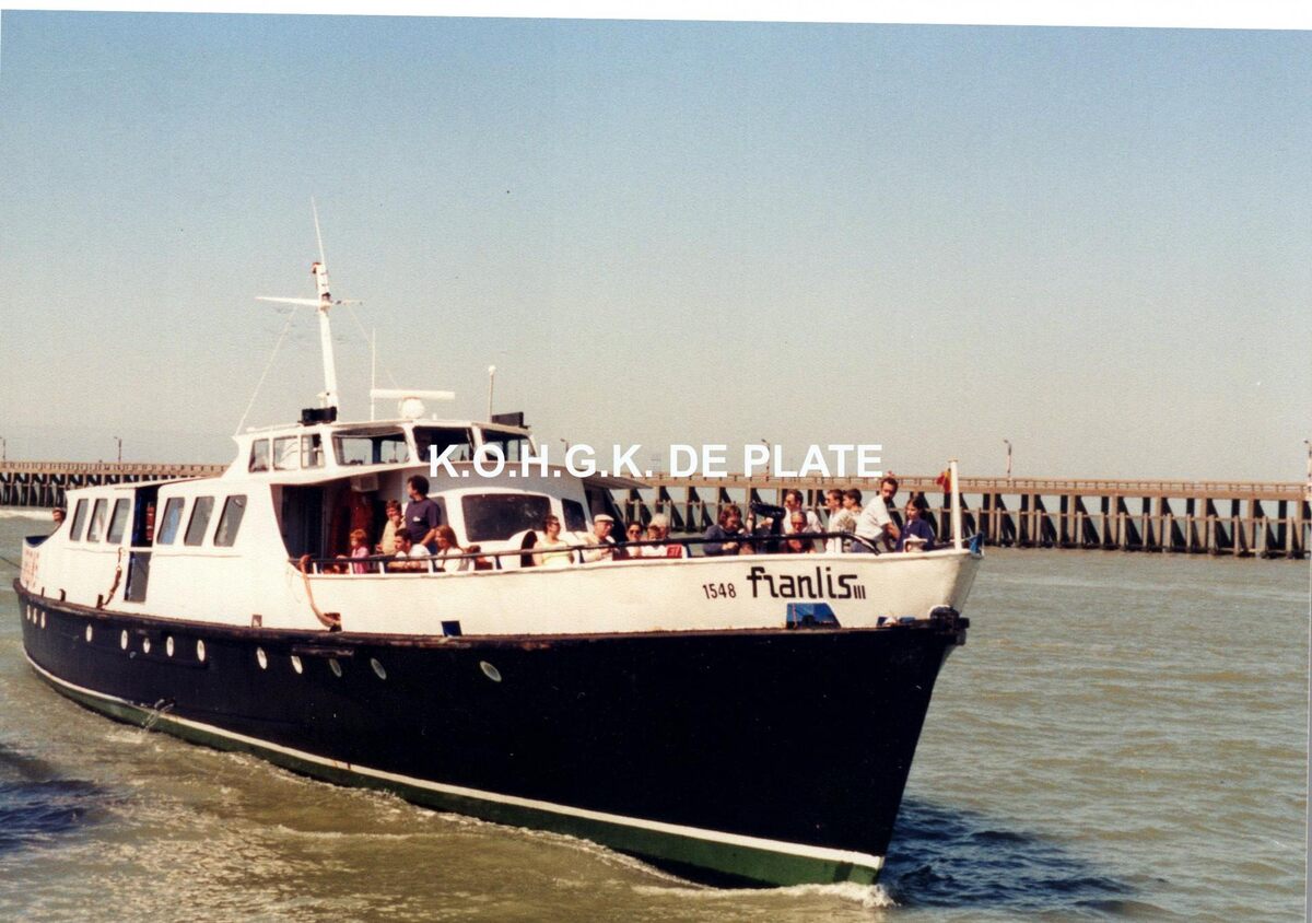 Formaat : 9 x 13 cm. - Excursieschip "Franlis" in de havengeul. In de achtergrond het Ooststaketsel