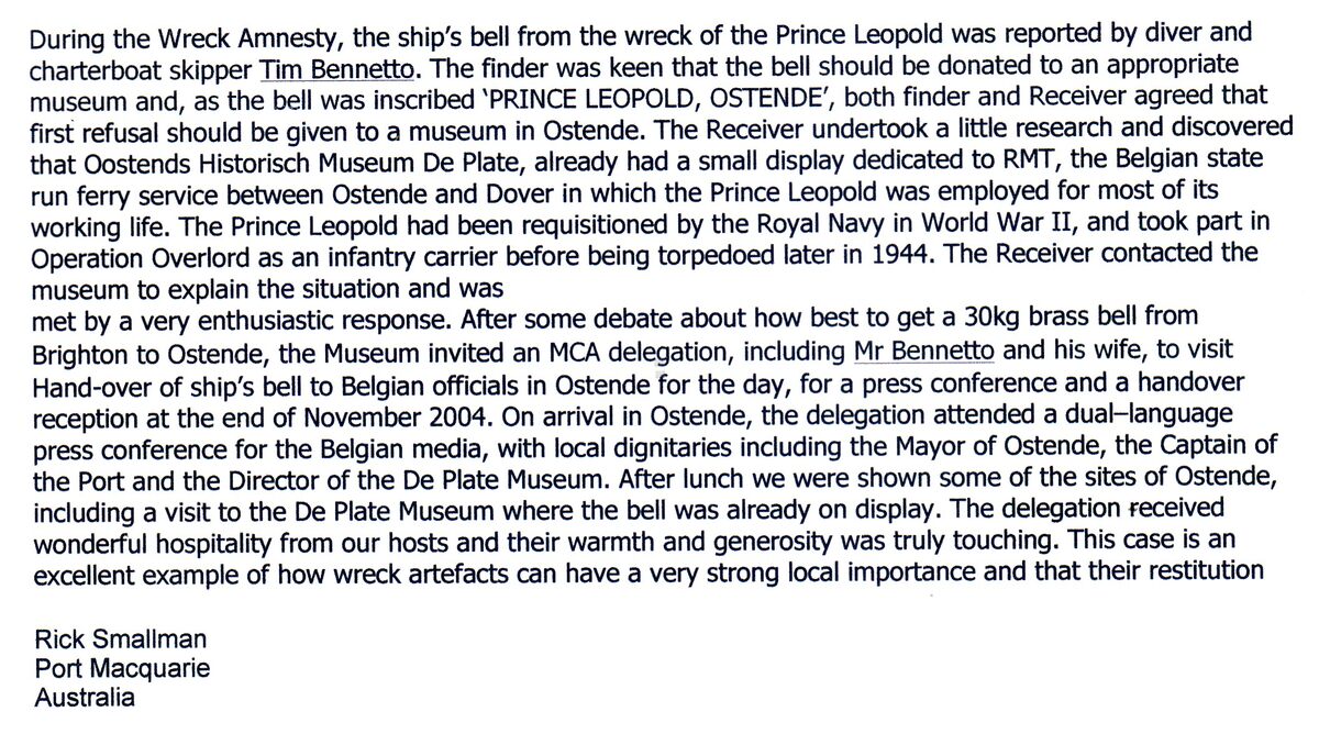 Formaat : 10 x 15 cm. - De scheepsbel van de "Prince Leopold" met duiker (vinder) Tim Bennetto