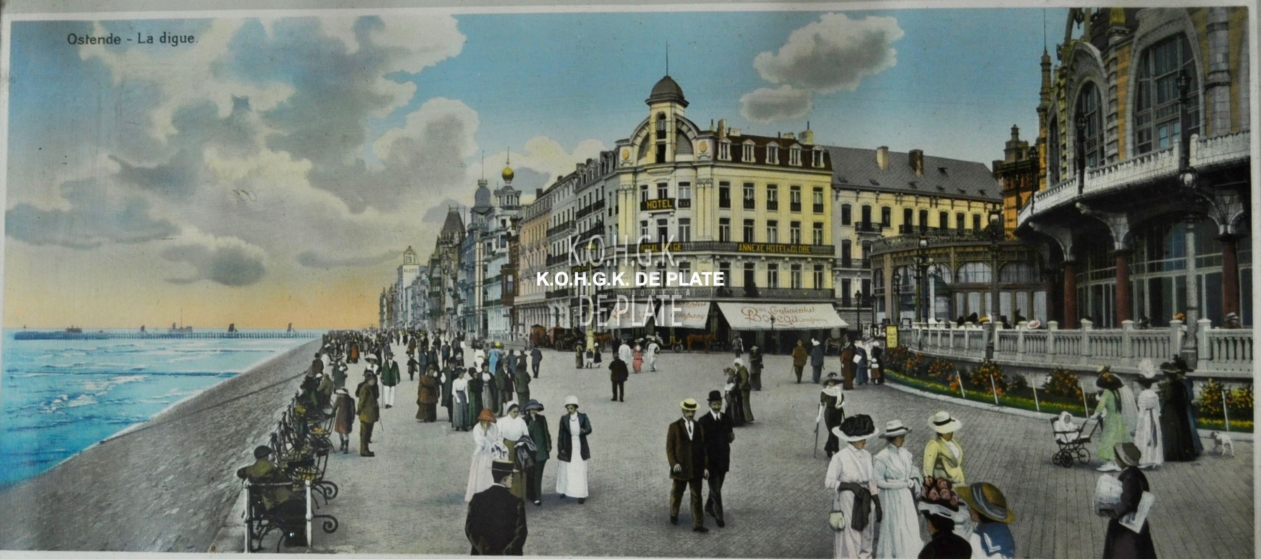 Rechts het kursaal. Op de hoek van de Kursaal-Oosthelling, het "Hotel Royal Belge" waar paard en kar staan te wachten om reizigers te vervoeren. Verder op de Zeedijk, de oude hotels en villa’s en veel wandelaars