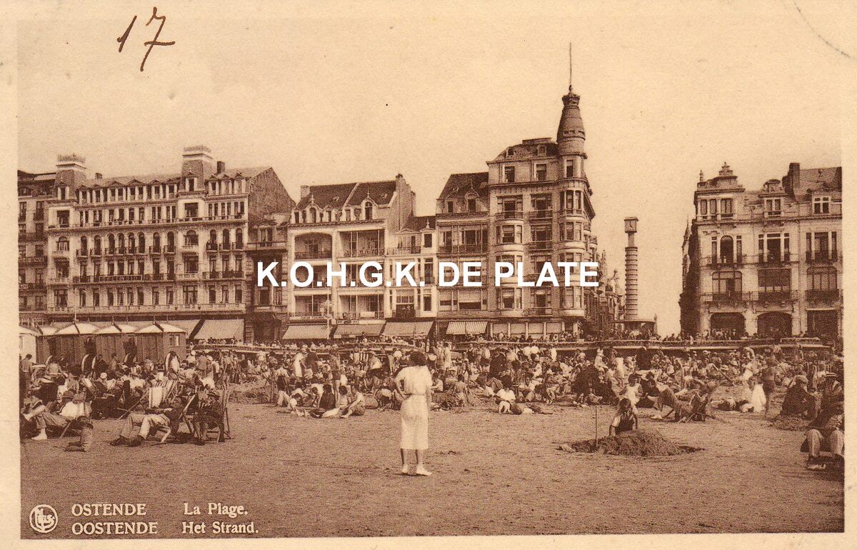 Nels. - Ostende - La Plage. Oostende - Het Strand. - Strandrecreatie op het Groot Strand, nabij de badinstallaties onder de Albert I-promenade. Links, "Hotel Splendid", volledig vernield tijdens de Tweede Wereldoorlog. In het midden, de lichtkolom met openbaar uurwerk van de badinstallaties. Er achter, de Kemmelbergstraat.