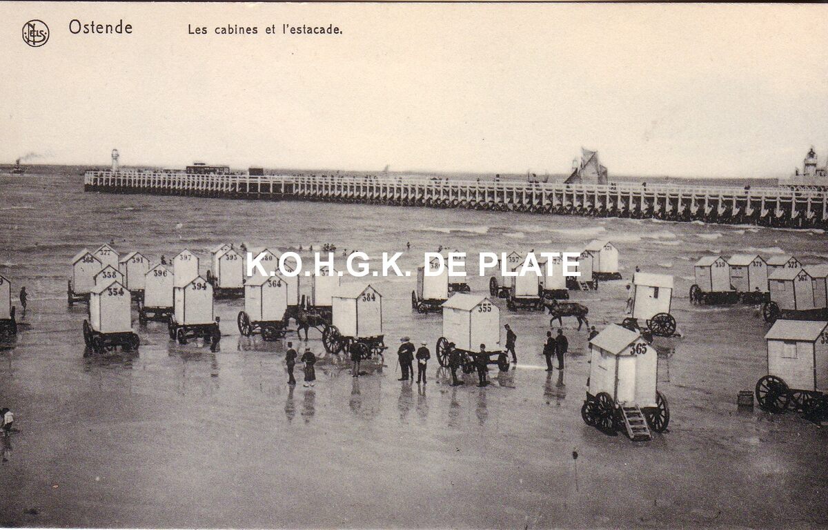 Nels. - Ostende - Les cabines et l'estacade. - De badkarren op het Klein Strand. Rechts, het Weststaketsel