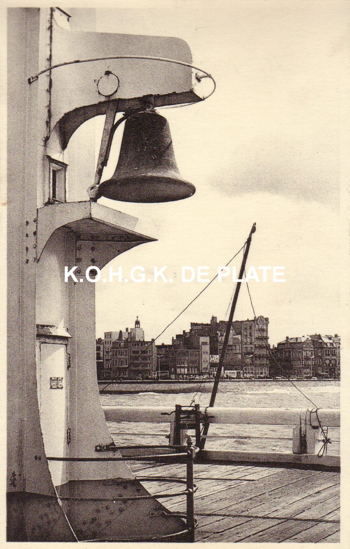 Walschaerts. - Het einde van het Weststaketsel met het ijzeren torentje en mistbel. Op de achtergrond, de Albert I-promenade. We zien ook de toren van het Feest- en Kultuurpaleis op het Wapenplein.