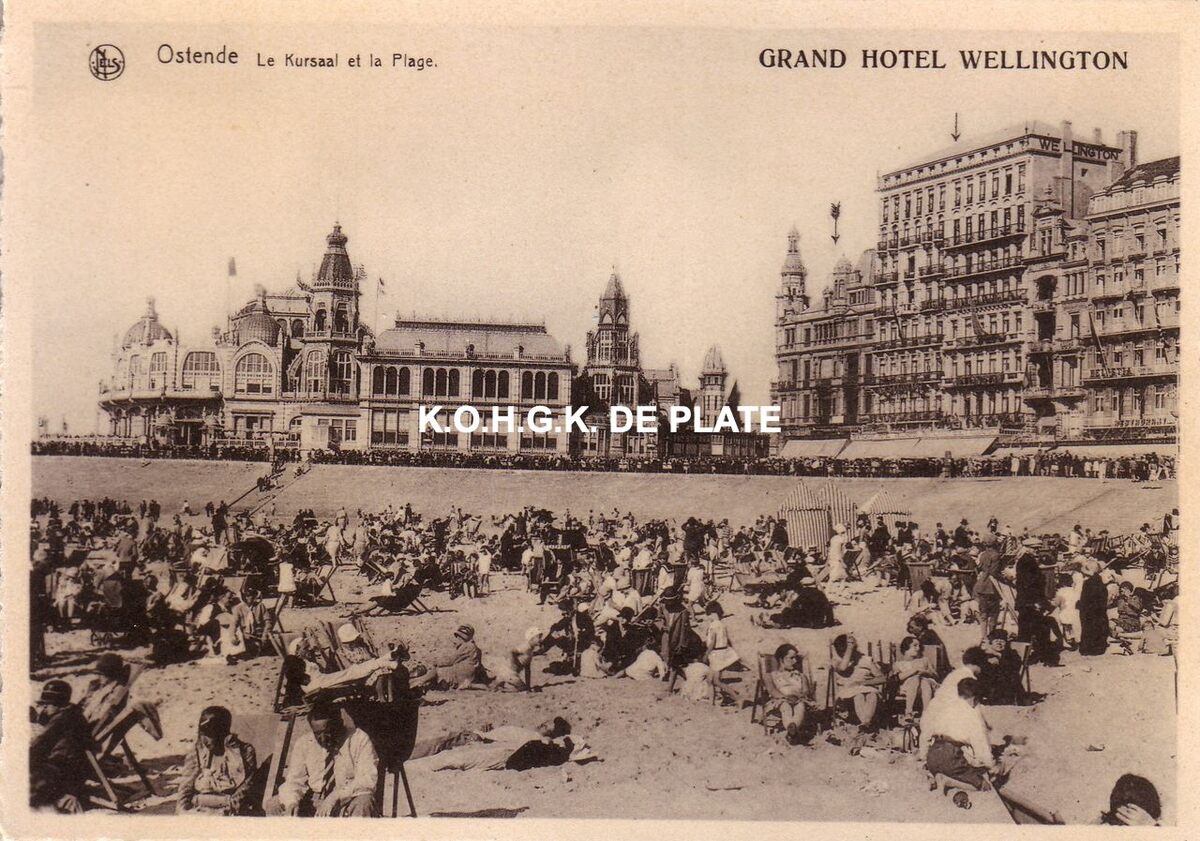 Nels. - Ostende - Le Kursaal et la Plage. - Strandrecreatie op het Groot Strand. Rechts, het "Hotel Wellington" op de hoek van de Zeedijk en de Kursaal-Westhelling. Links, de westgevel van het derde Kursaal.